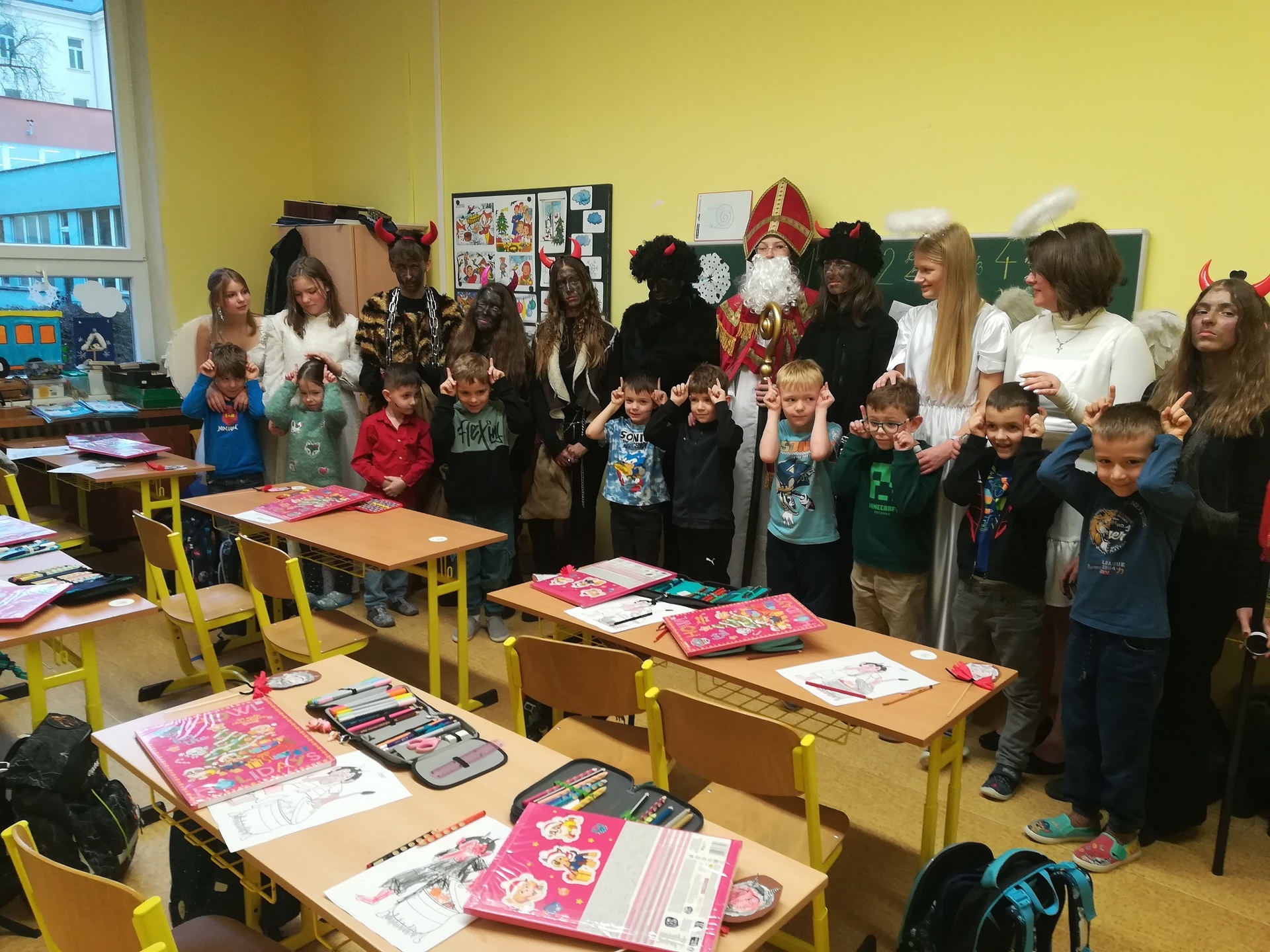 Minulý pátek byl dnem mnoha zážitků nejen v přípravné třídě. Po škole totiž chodil Mikuláš. Jeho doprovodem bylo plno čertů, ale i andělů, kteří se snažili, aby se některé děti čertů nebály a aby některé děti taky neodnesli, protože se občas jako ti čerti chovají. Před nadílkou od Mikuláše si mohli žáci všech tříd na I. stupni zazpívat vánoční písně s herci divadla Matýsek a tím rozsvítit srdce anděla, na kterého se během představení dívali.