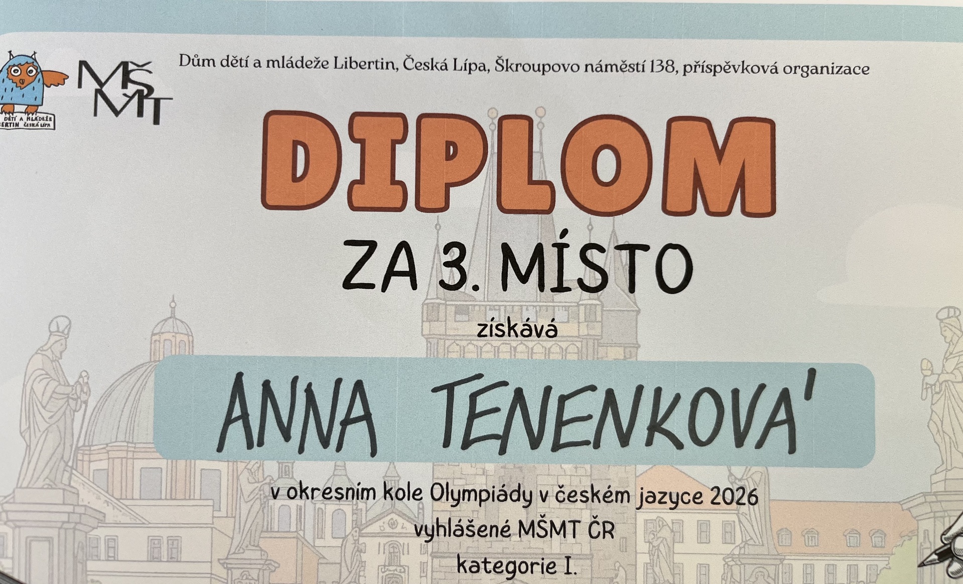 Dne 27. ledna 2026 proběhlo v České Lípě okresní kolo Olympiády v českém jazyce. Účastníci opět soutěžili v jazykových a stylistických dovednostech. V I. kategorii pro 8. a 9. ročníky a víceletá gymnázia získala Anička Tenenková z 9. D skvělé 3. místo s postupem do krajského kola a Alan Rosenkranz z 8. D obsadil důstojné 11.-13. místo.